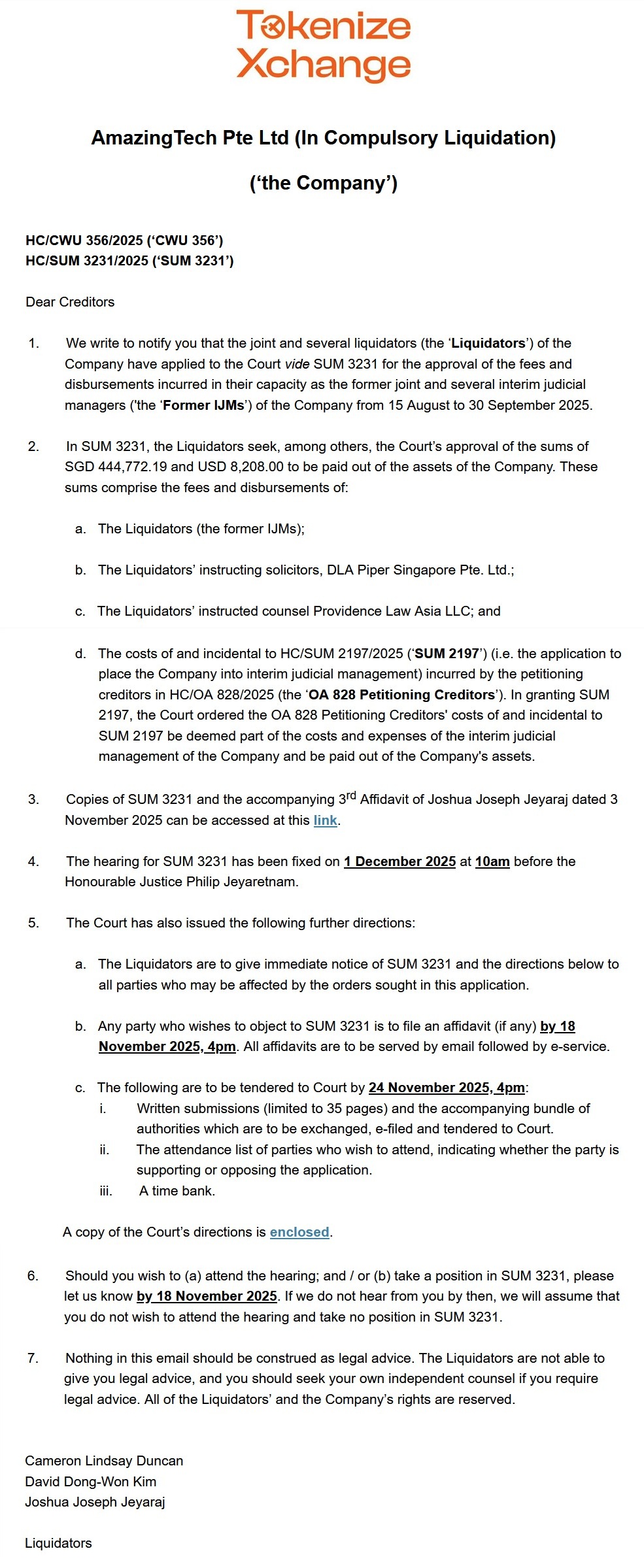 This Opinion post first appeared in my blog here: https://pwlcm.wordpress.com/2025/11/05/tokenize-exchange-liquidator-update-on-5-november-2025/