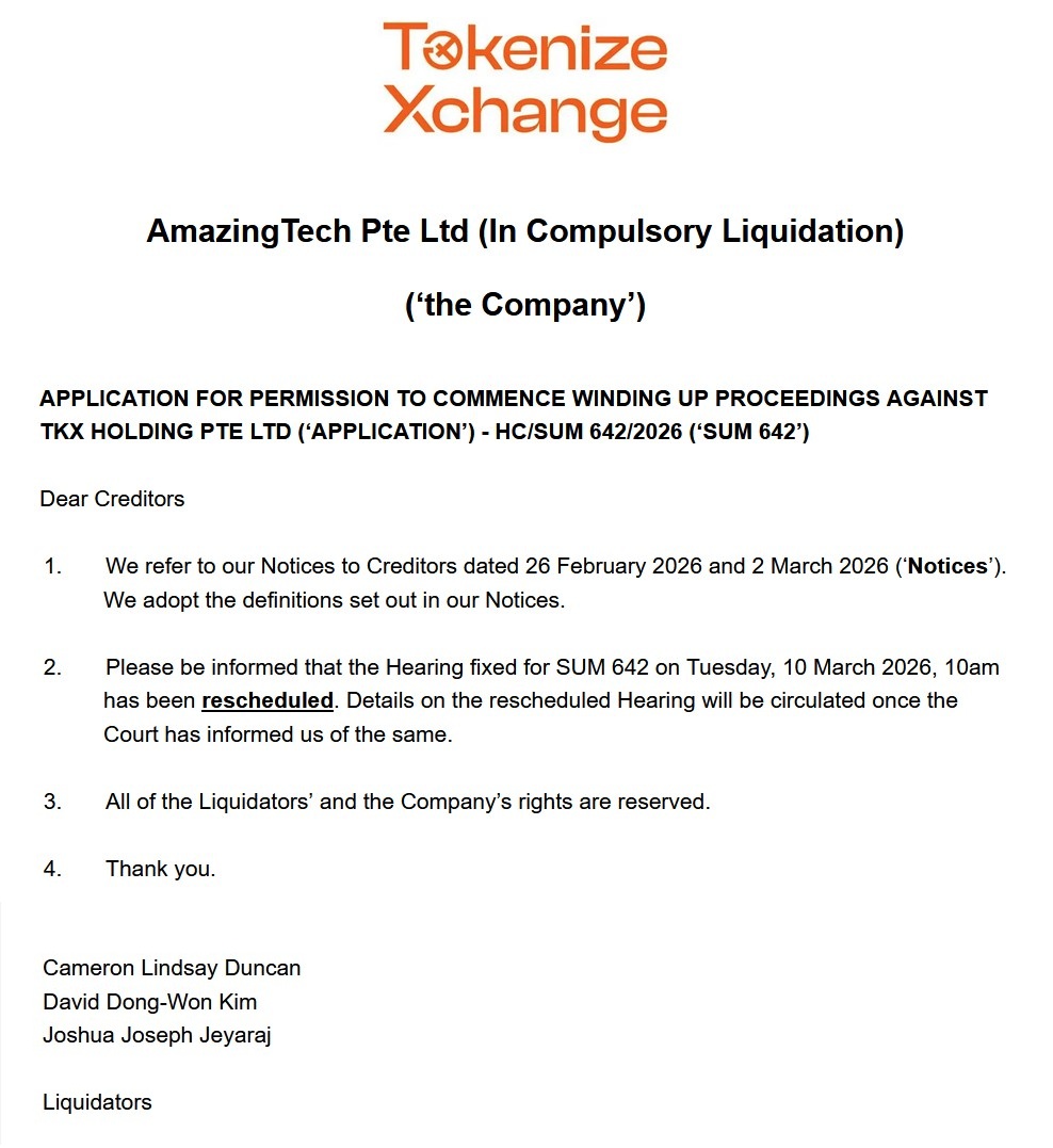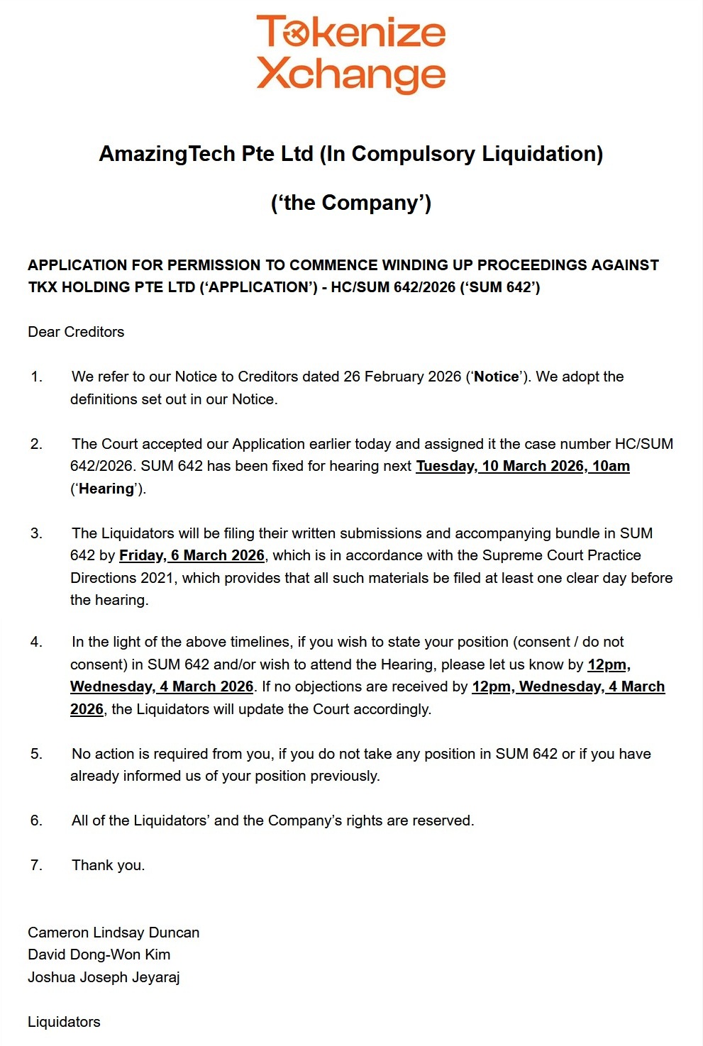 Basically the Court has accepted the application to liquidate Tokenize Exchange Holding (TKXH) and assigned a case number SUM 642 to the case. The hearing is set to be on 10 March 2026 at 10am.