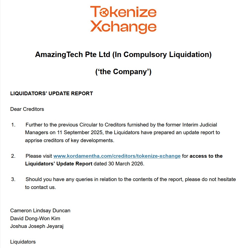 This Opinion post first appeared in my blog here: https://pwlcm.wordpress.com/2026/03/31/tokenize-exchange-liquidator-updates-on-30-march-2026/