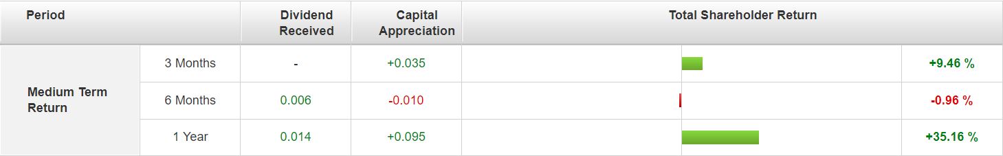 Majority of the return came from capital appreciation (S$0.095), while the remaining return is derived from a total dividend amount of S$0.014.