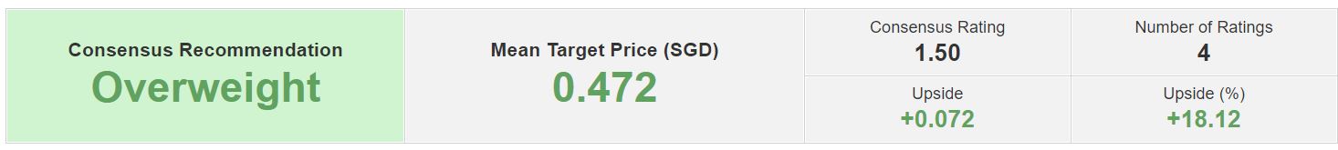 Based on the analyst consensus estimates, Kimly has a “Buy” recommendation with a mean target price of S$0.47. This translates into a potential upside of 18.12% based on the share price of S$0.40.