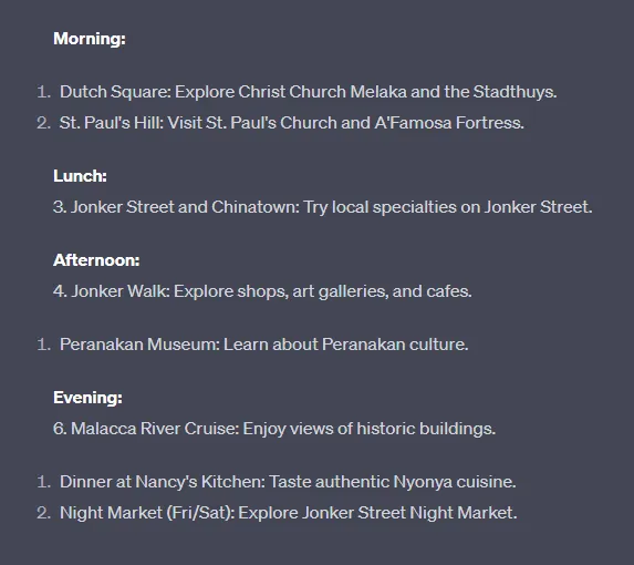 We asked ChatGPT to help with a short day trip to Malacca, and here’s what it came up with: