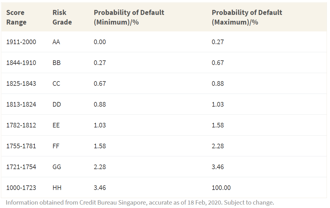 A credit score is a 4-digit number based on your past payment history and indicates the likelihood of you defaulting your loans. The highest score on the scale is 2,000, while the lowest score is 1,000 – and anything between 1,000 to 1,723 would count as a bad credit rating. In Singapore, only 2 credit bureaus issue credit reports and scores: the Credit Bureau of Singapore (more common) and the Experian Credit Bureau.