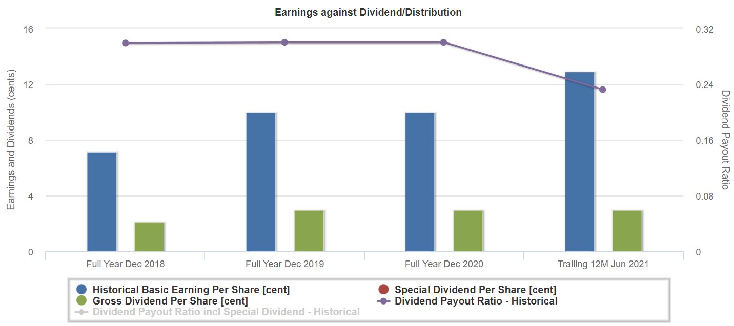 After experiencing a 40% year-on-year jump in its total dividend per share in FY2019, Frencken has kept its total dividend per share unchanged at 3.0 Singapore cents for FY2020. This translates into a dividend payout ratio of 30%, which is similar to FY2019.