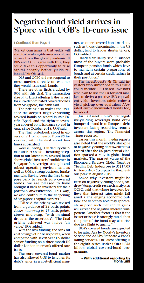 Two days ago, UOB issued a EUR-denominated covered bond with a -0.21% yield-to-maturity. Many might be wondering why would any investor want to invest in a bond with a negative yield. We explain why…