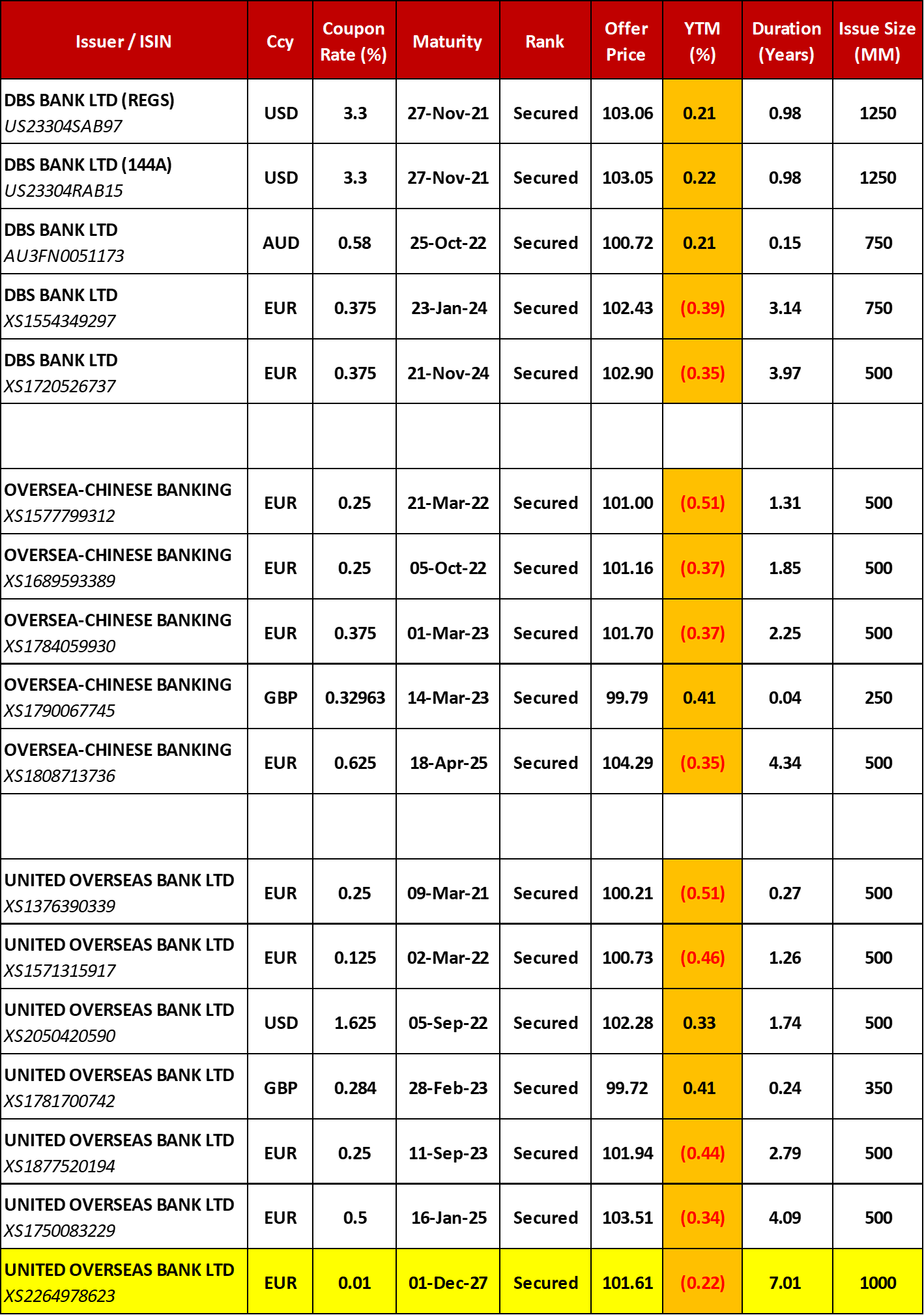 In the below table, we have compiled the full list of covered bonds that have been issued by the three local banks, and are currently tradable on the secondary market. We have sorted the bonds by their maturity dates. The recent UOB bond issue is highlighted in yellow.