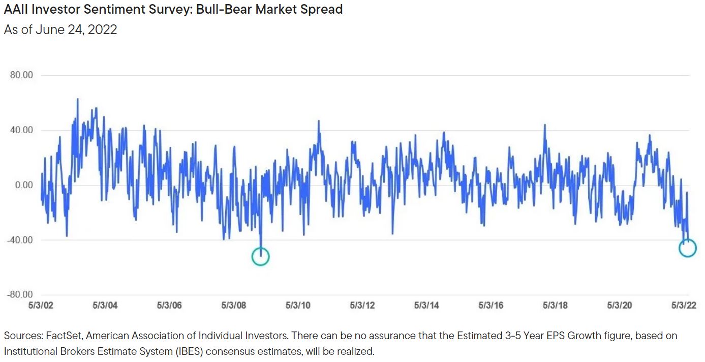 Global markets are at a crossroads, reflecting deep concerns around inflation, interest rates, moderating economic growth, and elevated geopolitical uncertainty in Europe as it pertains to the Russia-Ukraine war and its potential ripple effects. Market sentiment has swung dramatically, from bullish peaks in 2021 to extremely bearish levels in recent weeks. Indeed, sentiment indicators are close to the lows of 2009. This is notable considering that the state of the economy today is certainly stronger than 2009, when the US economy was reeling from the impact of significant financial imbalances and an imploding housing market.