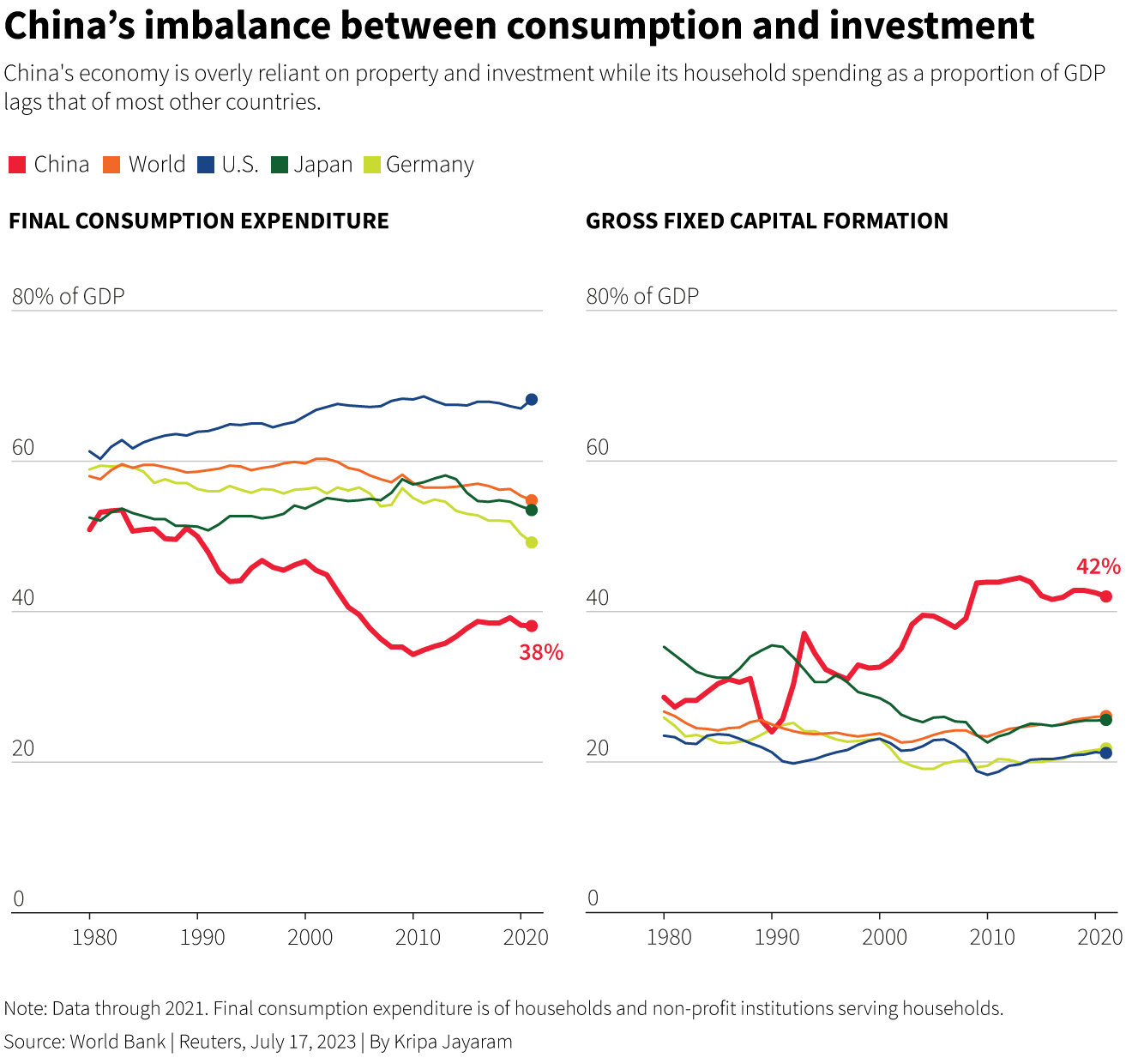 Property Crisis: The property sector in China faces turmoil, affecting individual wealth levels and reducing household consumption. Lowered spending, particularly in the form of fewer loans disbursed to SMEs, has added to these woes.