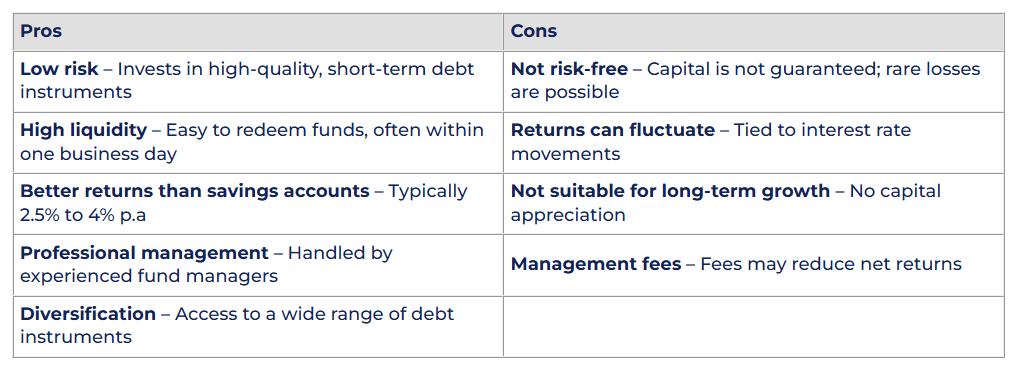 Here’s a quick breakdown of the pros and cons of investing in money market funds.