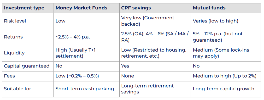If you’re deciding between MMFs, CPF savings, and traditional mutual funds, here’s a simplified comparison to help you choose: