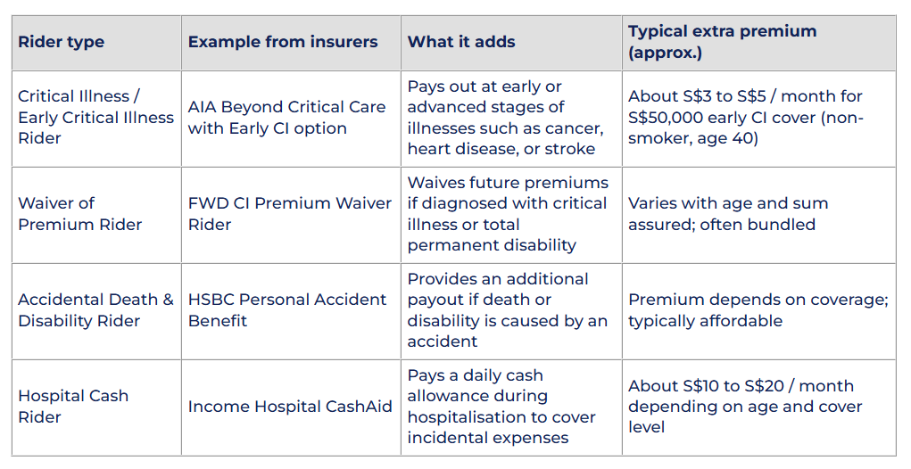 Insurance policies in Singapore often allow you to add a rider. A rider is an extra feature you attach to your base plan to extend coverage in ways that suit your needs.