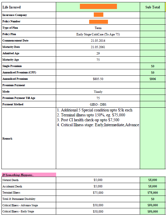 It would be good to have a list of insurance policies that you and your family having and keep them all in one place. Some insurance agents would do an insurance summary free for you, all you have to do is ask them. If you are paying your premium yearly through GIRO, then it is even more important to have the list with the payment date so that you could prepare sufficient funds in your account. You do not want to miss out on any payment and lost your coverage, do you?
