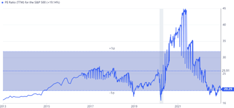 Furthermore, the P/E ratio of the S&P 500, an index tracking the United States stock market has fallen near to pre-pandemic valuation, signaling an attractive entry point for investors for long-term capital gains.
