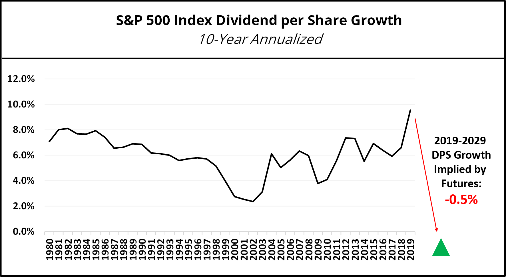 In the chart below, we show the dividend per share (DPS) for the S&P 500 Index from 2007 to 2019, followed by the DPS implied by the Futures market from 2020 to 2030.