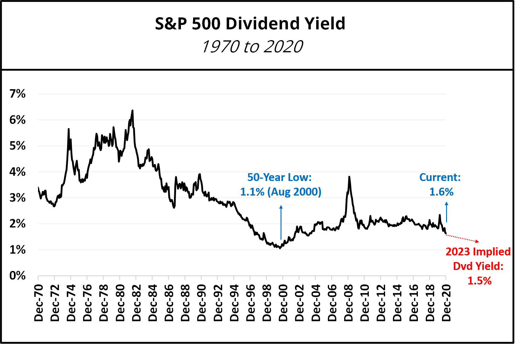 The chart below shows the S&P 500’s Dividend Yield since 1970. We note that a 1.5% dividend yield would be on the low end historically. As such, we do agree that the 2023 S&P 500 Dividend Futures is relatively cheap now.