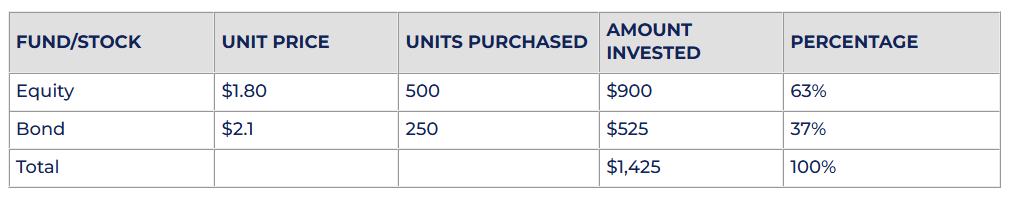 Here’s an example of portfolio rebalancing for Alex, who has a balanced risk appetite portfolio. He asked for a 50-50 split between equity and bonds and invested $1,000 at the start of the year.