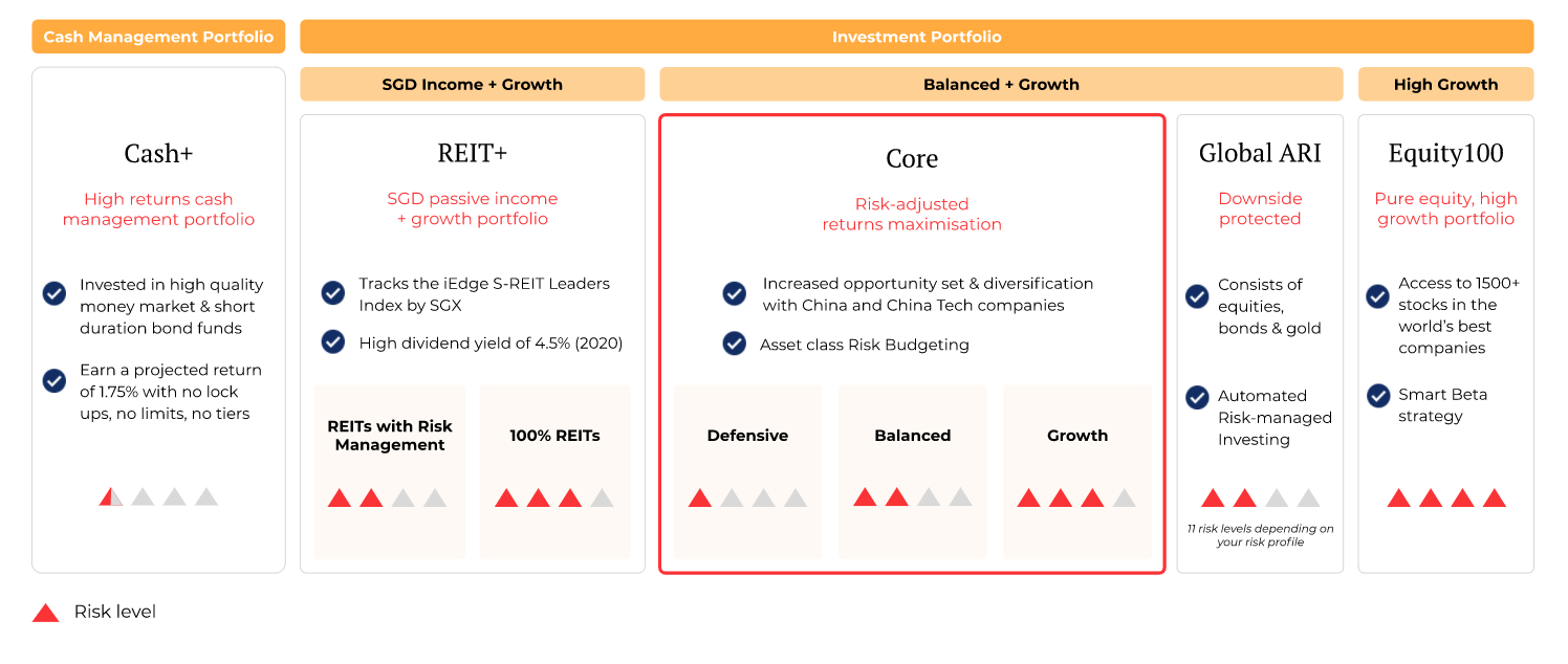I took a look at their different offerings and all of them involves less volatile assets like bonds and gold. Personally, I like their allocation amount into the Chinese tech stock as compared to another portfolio like the Global ARI.