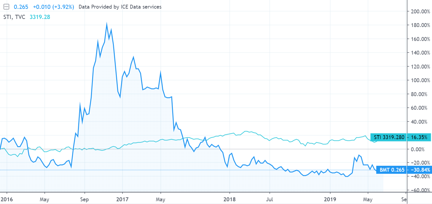 For the last year, the share price of BMT declined by 17.19%. Over the last 5 years, BMT’s stock price has had mixed performance with respect to the STI.