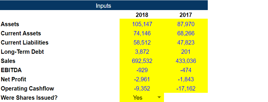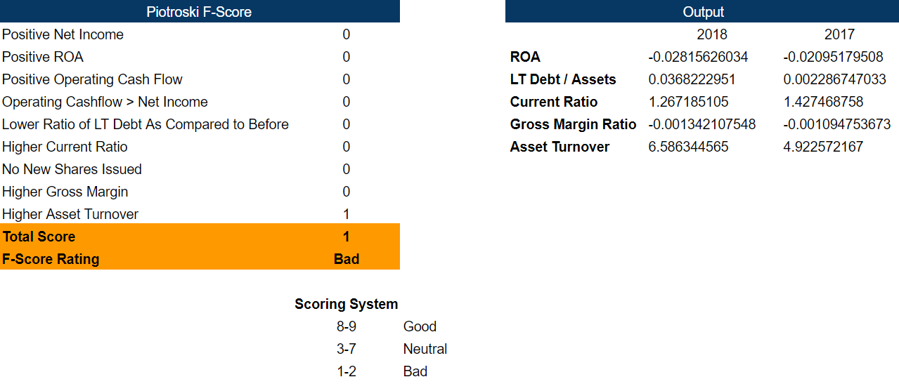 For my analysis, I will be using the Piotroski F-Score. It assigns a number between 0-9 which is used to determine the strength of a company’s financial position. Comparing 2018 vs 2017, the criteria awarded with a point (1) means there was an improvement from the previous year and vice-versa (0).